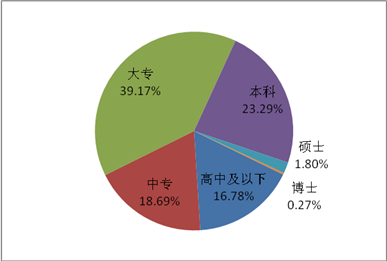 从用人单位所需学历情况看(如图1),对博士学历的需求占0.27%,较2011年第四季度0.32%下降0.05%;对硕士学历的需求占1.80%,较2011年第四季度1.86%下降0.06%;对本科学历的需求占23.29%,较2011年第四季度26.16%下降2.89%;对大专学历的需求占39.17%,较2011年第四季度38.55%上升0.62%;对中专学历的需求占18.69%,较2011年第四季度19.19%下降0.50%;对高中及以下学历的需求占16.78%,较2011年第四季度13.91%上升2.87%。其中大专及以上学历需求占64.53%,较2011年第四季度66.9%下降2.37%。