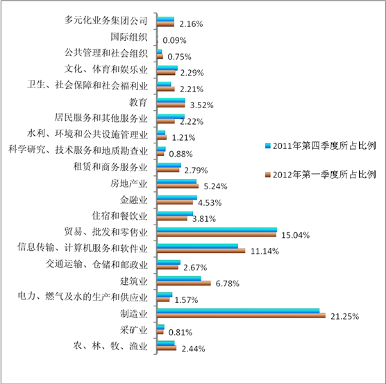 从用人单位行业需求看(如图3),制造业仍高居榜首,高出排名第二的贸易、批发和零售业6个百分点,其所占比例为21.25%,较2011年第四季度20.49%上升0.76%。其他排名较往前的是信息传输计算机服务和软件业。通过与2011年第四季度对比,用人单位行业需求变化不明显。