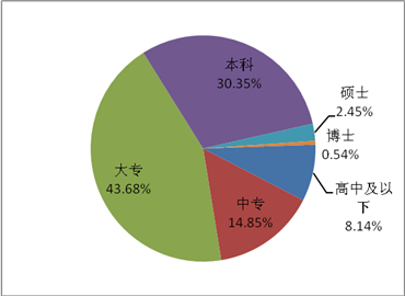 从求职人员学历情况看(如图4),博士学历的占0.54%,较2011年第四季度0.49%上升0.05%;硕士学历的占2.45%,较2011年第四季度3.10%下降0.65%;本科学历的占30.35%,较2011年第四季度38.16%下降7.81%;大专学历的占43.68%,较2011年第四季度42.26%上升1.42%;中专学历的占14.85%,较2011年第四季度9.87%上升4.98%;高中及以下学历的占8.14%,较2011年第四季度6.12%上升2.02%。其中大专及以上学历的占77.02%,较2011年第四季度84.01%下降6.99%。