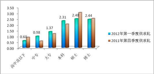 2、2012年第一季度用人单位需求和求职人员学历对比