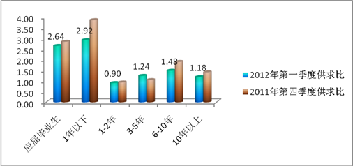 如图8所示,本季度工作经验的供求比集中在1:0.90到1:2.92之间,其中应届毕业生和具有1年以下工作经验的供求比最高,分别为1:2.64和1:2.92,较2011年第四季度均有所缓和,但仍明显是供不应求。具有1-2年工作经验的供求比最低,为1:0.90,供不应求,较2011年第四季度基本持平。究其原因是,现在在企业提供的岗位中,近七成都要求求职者有1年以上的工作经验。不仅技术性较强的岗位要求工作经验,甚至连文秘、出纳等岗位也要求有工作经验。因为一些岗位对技术要求比较高,一般要工作两年以上才能独立工作,所以现在的用人单位更加注重求职者的实践经验以及从业经历,对求职者实际工作能力和综合素质的考察力度加大。现在工作经验已经成为应届毕业生求职的拦路虎。