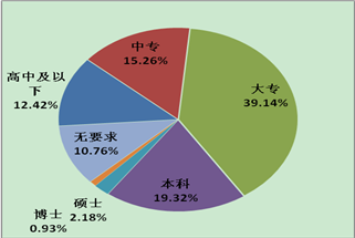 (三) 本季度用人单位对大专学历的需求有较大幅上升,所占比例为39.14%,与2012年第四季度相比上升5.56%。对本科学历的需求占19.32%,与2012年第四季度相比下降3.47个百分点。对学历无要求的用人单位比例在减少,与2012年第四季度相比减少2.13个百分点。