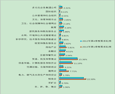 本季度用人单位行业需求没有明显变化(如图3),制造业仍排名第一,所占比例为22.50%,高出排名第二的贸易、批发和零售业7个多百分点,与2012年第四季度相比,所占比例上升2.09个百分点。信息传输、计算机服务和软件业所占比例为11.19%,与2012年第四季度相比仅上升1.02个百分点。