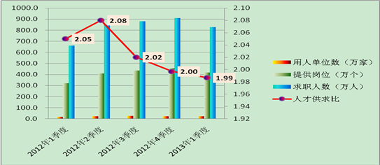 (一) 本季度人才市场就业相比以往变化不大,形势总体平稳。本季度岗位供求比为1:1.99,岗位供不应求,与2012年第四季度1:2.00相比,基本持平。