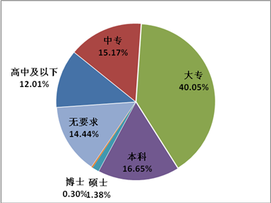 从用人单位所需学历情况看(如图1),对博士学历的需求占0.30%,与上季度0.27%相比上升0.03%;对硕士学历的需求占1.38%,与上季度1.80%相比下降0.42%;对本科学历的需求占16.65%;对大专学历的需求占40.05%,与上季度39.17%相比上升0.88%;对中专学历的需求占15.17%,与上季度18.69%相比上升3.52%;对高中及以下学历的需求占12.01%,与上季度16.78%相比下降4.77%;对专业无要求的占14.44%。其中对大专以下学历的需求占28.18%,与上季度35.47%相比下降7.29%,这说明用人单位对求职者的学历要求逐渐提高。