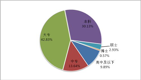 从求职人员学历情况看(如图4),博士学历的占0.57%,与上季度0.54%相比上升0.03%;硕士学历的占2.93%,较2012年第一季度2.45%上升0.48%;本科学历的占30.13%,与上季度30.35%相比下降0.22%;大专学历的占42.83%,与上季度43.68%相比下降0.85%;中专学历的占13.64%,与上季度14.85%相比下降1.21%;高中及以下学历的占9.89%,与上季度8.14%相比上升1.75%。其中大专及以上学历的占76.47%,与上季度77.02%相比下降0.55%。