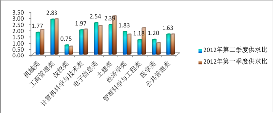 1、2012年第二季度用人单位需求和求职人员所学专业对比