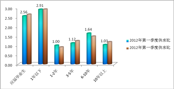 4、工作经验6年以上求职人员就业压力明显加大,供求比大于1:4。用人单位需求1-2年工作经验的人才最多,所占比例为24.60%,较2012年第一季度27.29%下降2.69%。对应届毕业生的需求所占比例为18.72%,较2012年第一季度19.60%下降0.88%。