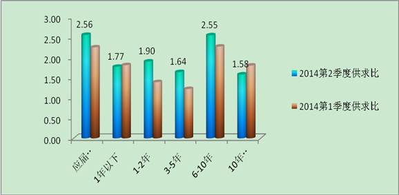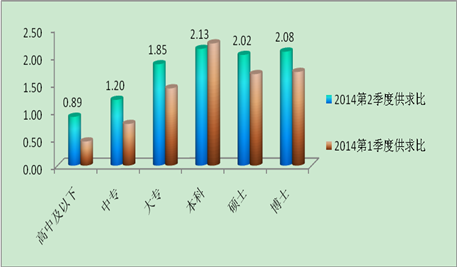 通过对2014年第二季度人才市场供求情况及各地区对比情况的比较分析,我们认为,求职人员的意向单位、专业、意向职位与市场需求依旧存在不匹配、不适应的现象。