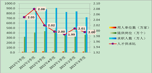 通过对2013年第三季度人才市场供求情况的分析及与前期的比较分析,我们认为,人才市场上供求不匹配的问题由来已久,不是短时间内能够解决的问题,我们需要立足当前,着眼长远,多管齐下,采取相关措施逐步解决就业难题。