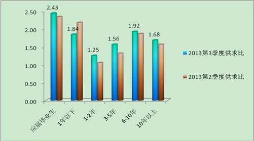 如图9所示,本季度工作经验的岗位供求比在1:1.25到1:2.43之间,均供小于求。其中应届毕业生的岗位供求比最高,为1:2.43,求职竞争最激烈。具有6-10年工作经验的岗位供求比排名第二,为1:1.92。具有1-2年工作经验的岗位供求比最低,为1:1.25,最受用人单位亲睐。具有1年以下工作经验的岗位供求比为1:1.84,与上季度相比有明显下降。分析原因:现在多数用人单位在招聘时,对求职人员的工作经验有一定要求,不仅技术性较强的岗位,甚至连文秘、出纳等岗位也要求有工作经验,从而使得应届毕业生求职压力较大,并从另一个角度印证了为什么毕业生在毕业后1-2年内频繁跳槽。