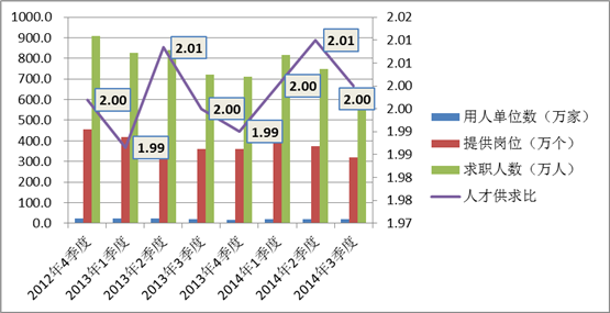 从供求总体情况看,本季度进入人才服务机构市场招聘的单位共18.4万家,提供招聘职位数319.0万个,登记求职人数638.0万人,人才供求比为2.00(即:岗位数为1时,求职人数为2.00,下同),环比就业压力略有缓解,同比持平。
