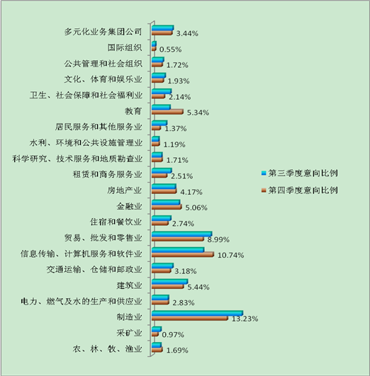 如表14所示,第三产业相比第一和第二产业,用人单位提供的就业机会比较多,所占比例为61.94%,高出第二产业达33.17个百分点,与第三季度相比,略有下降。求职者意向的产业类型也以第三产业为主,所占比例为56.78%,高出第二产业34.31个百分点,与上季度相比,下降幅度较小。求职者对第二产业的意向需求比上季度下降幅度较大,达3.9个百分点。
