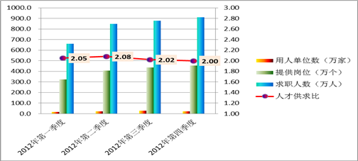 表1:2012年第一、二、三、四季度人才服务机构市场供求总体状况