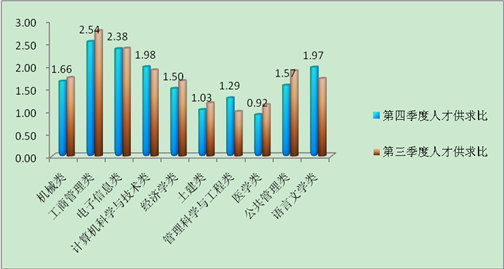 如图2所示,本季度专业的岗位供求比在1:0.92到1:2.54之间,与第三季度相比,岗位供求比之间的差距有所缩小。其中工商管理类专业岗位供求比仍居首位,供求比为1:2.54,与第三季度相比有小幅变化;其次是电子信息类专业,岗位供求比为1:2.38,与第三季度相比基本没有变化;医学类专业岗位供求比为1:0.92,岗位供大于求。分析原因:由于目前高校毕业生的专业类型与市场需求还存在不匹配现象,因此人才服务机构市场供需对接还存在差距。