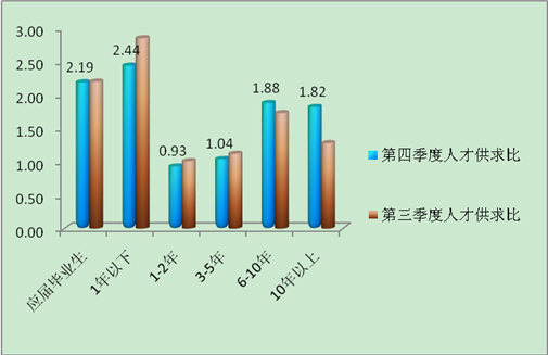 如图4所示,本季度工作经验的岗位供求比在1:0.93到1:2.44之间,其中具有1年以下工作经验的和应届毕业生岗位供求比最高,分别为1:2.44和1:2.19,但与第三季度相比,岗位供求比有所下降。具有1-2年工作经验的岗位供求比最低,为1:0.93,岗位供大于求。