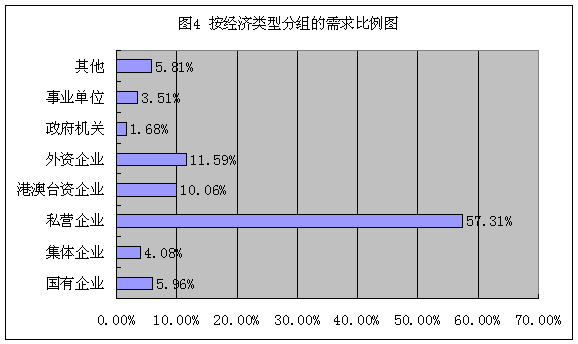 从经济形势分类情况看,用人单位人力资源需求数量排行依次是:私营企业人力资源需求数量占整个用人单位人力资源数量的57.31%,外资企业占11.59%,港澳台资企业占10.06%,国有企业占5.96%,其他类型企业占5.81%,集体企业占4.08%,事业单位占3.51%,政府机关占1.68%。