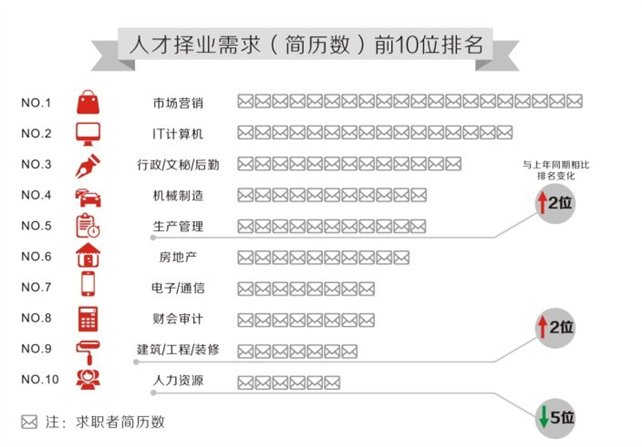 与去年相比,人才择业需求(求职者投递简历数)前10位排名中,除“市场营销”、“IT计算机”、“行政/文秘/后勤”、“电子/通信”与去年持平外,“机械制造”、“生产管理”和“建筑/工程/装修”较去年有较大幅度上升,“人力资源”的排名则下降幅度最大。