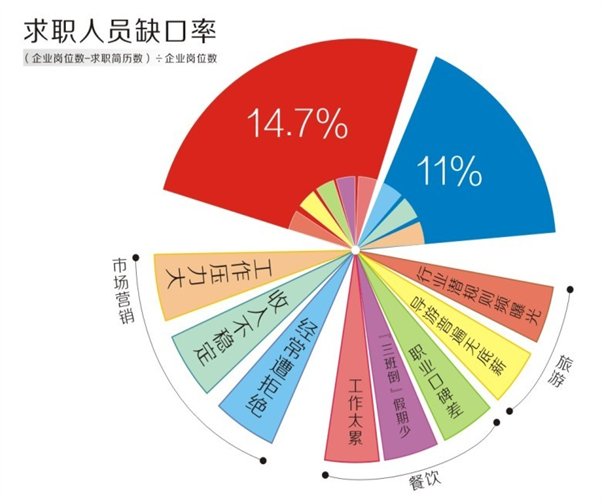 “市场营销”作为职场岗位“常青树”,求职人员缺口率在11%,“旅游/餐饮/娱乐”的求职人员缺口率在14.7%。武汉一家餐饮管理公司的行政负责人感叹目前企业处于“雪上加霜”的境地:“行业淡季又赶上招人难,大部分90后都觉得工作太累,‘三班倒’假期少,职业的口碑差。”智通人才市场部表示,虽然有部分餐饮企业通过放宽年龄限制,比如将年龄放宽至35岁来缓解用工矛盾,但并不能从根本上解决问题,人手还是紧缺。在宾馆酒店行业,管理、销售、餐饮等管理型岗位,以及中西餐厨师、通讯技术维护、餐饮客房服务等技能型人才较为急需。在旅游业,导游岗位普遍无底薪,随着吃回扣等业内“潜规则”逐渐被媒体频繁曝光,以及打击“强制购物”等行政措施的出台,导游们面临更加艰难的“生存环境”。这些都让求职者有所顾虑。