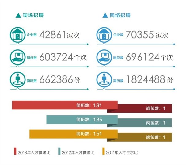 各类人才服务机构积极促进以高校毕业生为主体的就业工作,据统计,2013年1月至6月,湖北各类人才服务机构共举办了现场招聘会485场,进场企业42861家次,提供招聘岗位603724个次,进场求职人员简历数为662386份;各类人才网站登记招聘企业70355家次,新增就业岗位696124个次,活跃个人求职简历数为1824488份。上半年总体岗位供求比为1:1.91(注:提供岗位数为1,求职人数为1.91)。