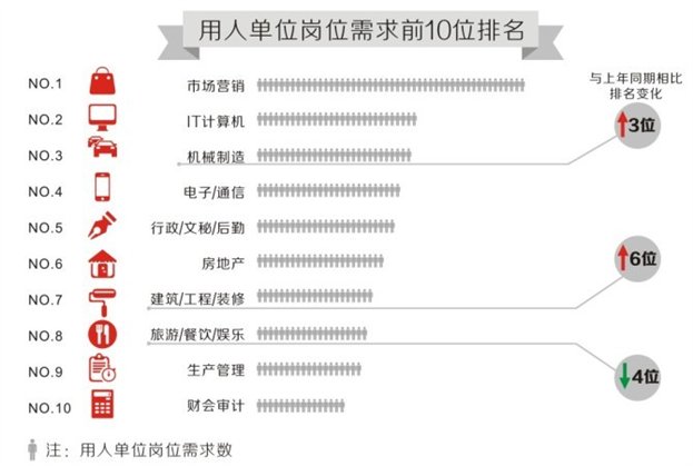 在人才需求排名前10的职业类型中,除“市场营销”、“IT计算机”、“房地产”、“财会审计”继续与去年同期持平外,需求量上升最快的职业为:“机械制造”和“建筑/工程/装修”。“旅游/餐饮/娱乐”需求量下降最快。