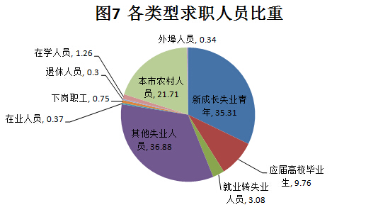 从求职人员类别分组来看,新成长失业青年、本市农村人员以及其他失业人员构成了本季度求职人员的主体,所占比重分别是35.31%、21.71%和36.88%。比较突出的一个特点是,本季度新成长失业青年所占比重较去年同期和上季度都有较大的提高,其中应届高校毕业生的比重虽然比去年同期有所下降,但较上季度而言有较大提升。这主要是因为本季度属于毕业季,大批毕业生开始走向工作岗位。