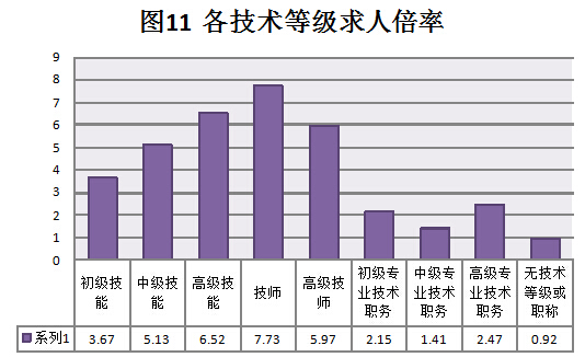根据数据可以得知,本季度对求职者没有技术等级和职业资格需求的岗位依然是最多的,虽然较上季度而言所占比例有所下降,但是依然占了高达76.91%的比例,同时求职者中无技术等级和职称的比例也是非常大高达84.38%。我市整体劳动力技术水平不高是不容争辩的事实,同时,我市缺乏高新技术产业以及技术含量较高的企业,相应的,属于这类企业的用人需求非常少,对技术型人才的要求也相对较少。但是根据数据也可以看出的是:本季度各级别的职业资格用人需求比例和各级别的专业技术职务的用人需求比例较上季度而言都有所提高。