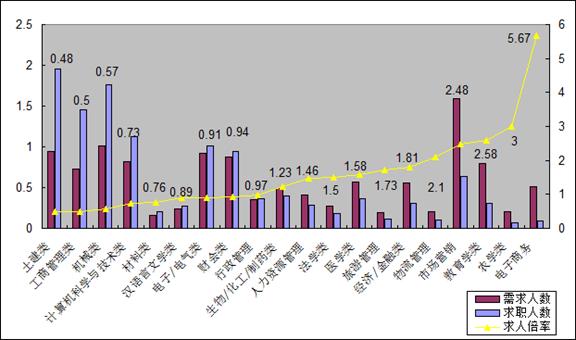 从需求排名前20位专业的供求对比情况看,需求大于供给的专业有11个,平均求人倍率为2.29,供给大于需求的专业9个,平均求人倍率为0.75,较上季度其供求结构性矛盾有所加剧。其中电子商务、农学类、教育学类和市场营销等岗位需求缺口最大,而求职压力则主要集中在土建类、工商管理类、机械类和计算机类专业上。